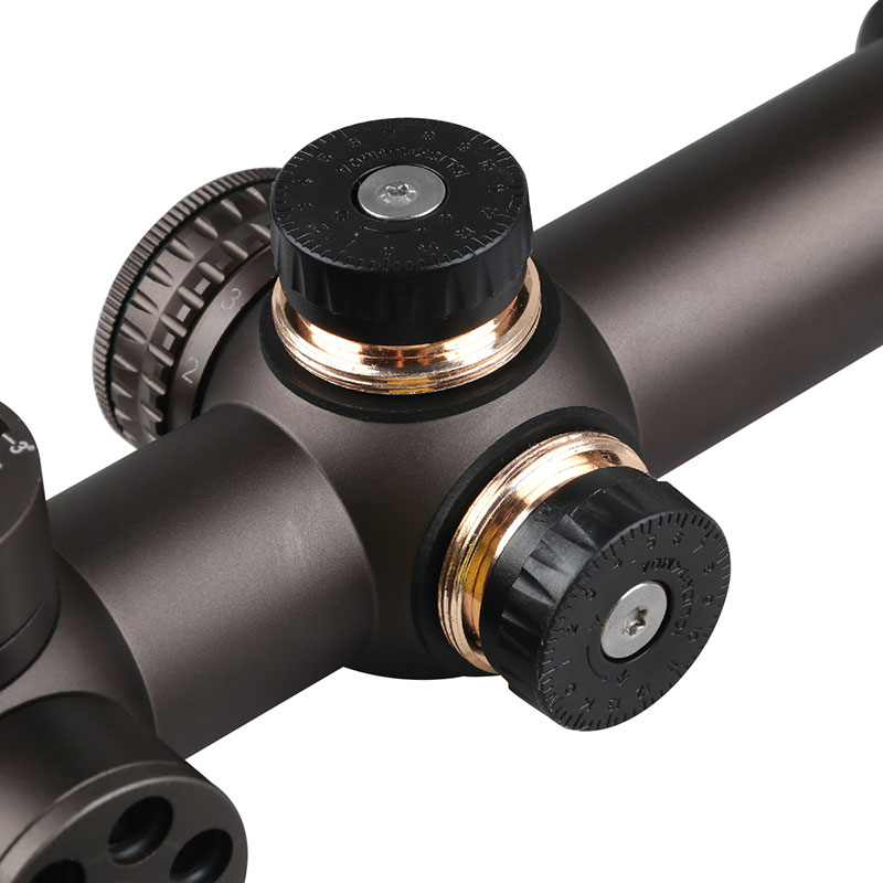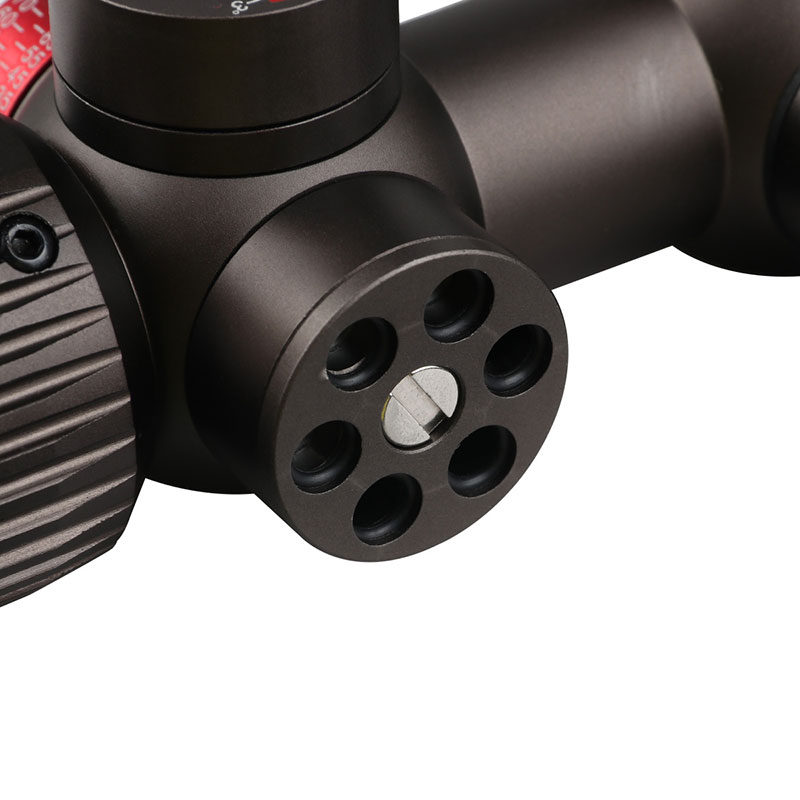 また、このスコープは操作性と機能性を考慮に入れられた設計となっており、快適な倍率調整が可能となる着脱式スローレバーに加え、 照度環境に応じてカラー調整可能なイルミネーションレティクル機能を搭載します。 レティクルはレッド・グリーンの二色に発光させることができ、各5段階の輝度を選択可能です。