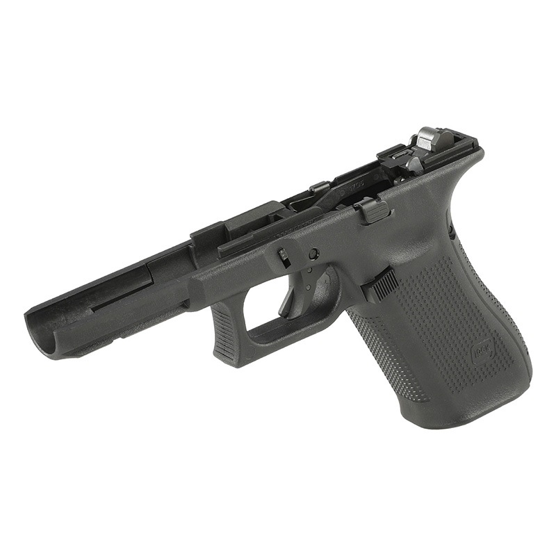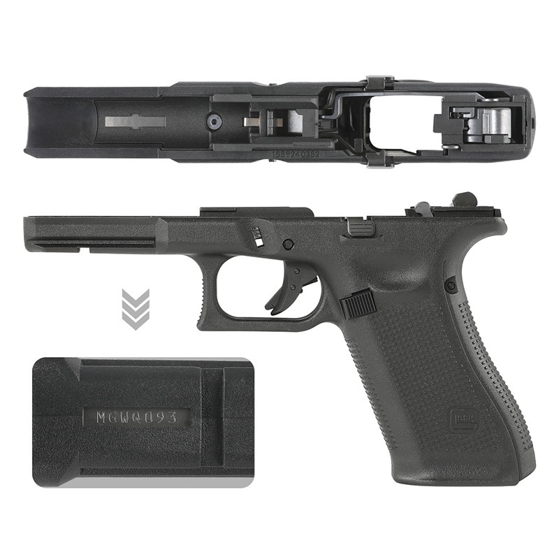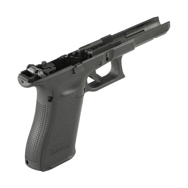 東京マルイ Glock 17 Gen.5 MOS GBBに対応しハンマーシャーシが組み込まれたコンプリートリアル刻印フレームです。スライドアッシーとマガジンを用意するだけで作動可能で内部パーツにもスチールパーツが多用されるなど抜かりがないです。繊維強化ナイロン樹脂を採用し、軽量かつ高い耐久性と剛性を兼ね備えた外装カスタムパーツです。