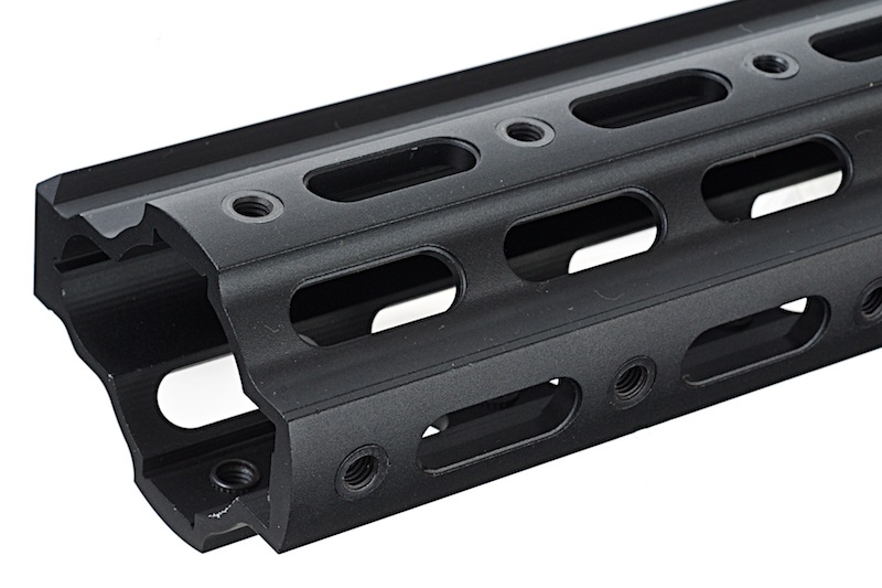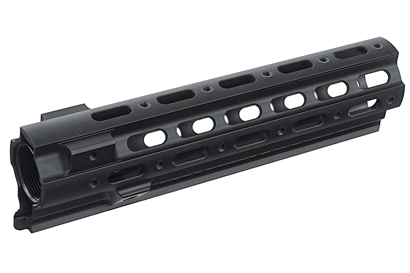 ガイズリータイプのSMR HK(Super Modular Rail)のレプリカです。 超軽量のフリーフロートタイプのハンドガードです。 シームレスな20mmトップレールは近・中距離用スコープをマウントするのに十分な長さで、 必要に応じて3、6、9時方向にアクセサリーレールを取り付けることで、アクセサリー類の拡張性も確保しています。 STD HK416 AEG対応(ミリピッチ規格)に対応しています。