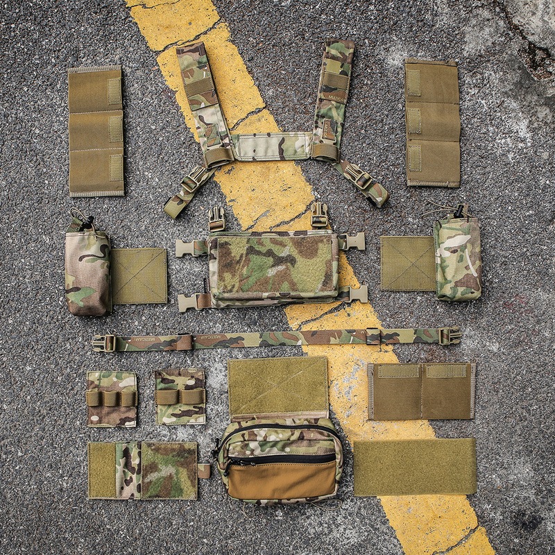 スピリトゥスシステムタイプマイクロファイトチェストリグは、特定の銃器のみを携帯するロービジリティーオペレーションに対応するよう設計された、民間/プロフェッショナル用チェストリグです。 特に瞬間的に発生する脅威に対して素早い対応が要求される場合に非常に効率的なデザインとなっています。 プラットフォームとなるシャーシをベースとし、それに個別のミッションで必要となるコンポーネントを装着することで、あらゆる形態に変化させることができるマルチロールなモジュラー性を備えています。