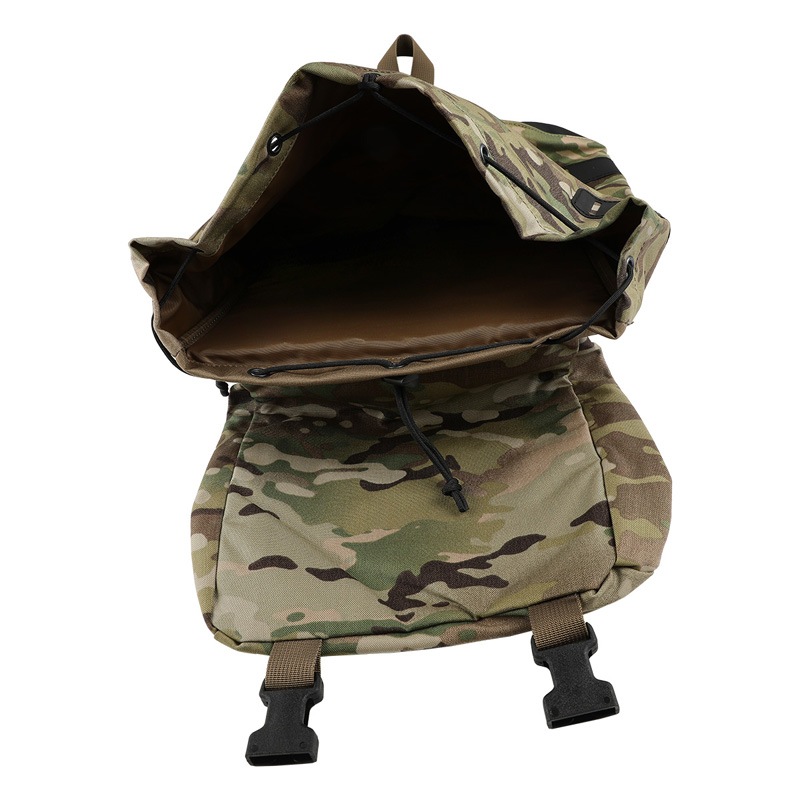メインコンパートメントは約30Lの容積で、サバイバルゲームに使用する装備品やスポーツ用品など、登山用具など 形状を問わず多くのアイテムを収納することができます。トップには絞りがあるため、収納物の脱落防止や、 中に入りきらない縦に長い物も絞って固定することが可能です。