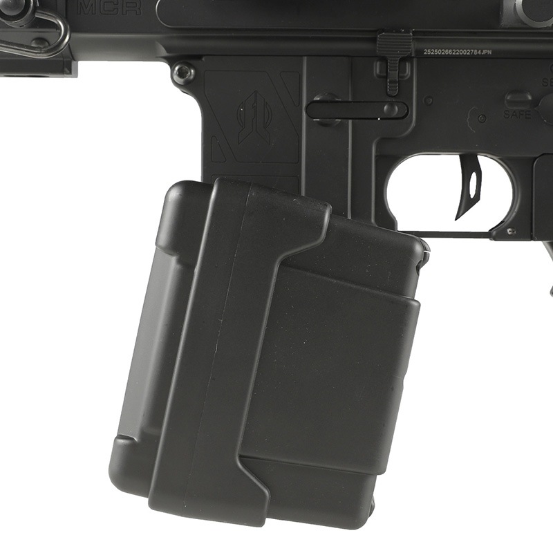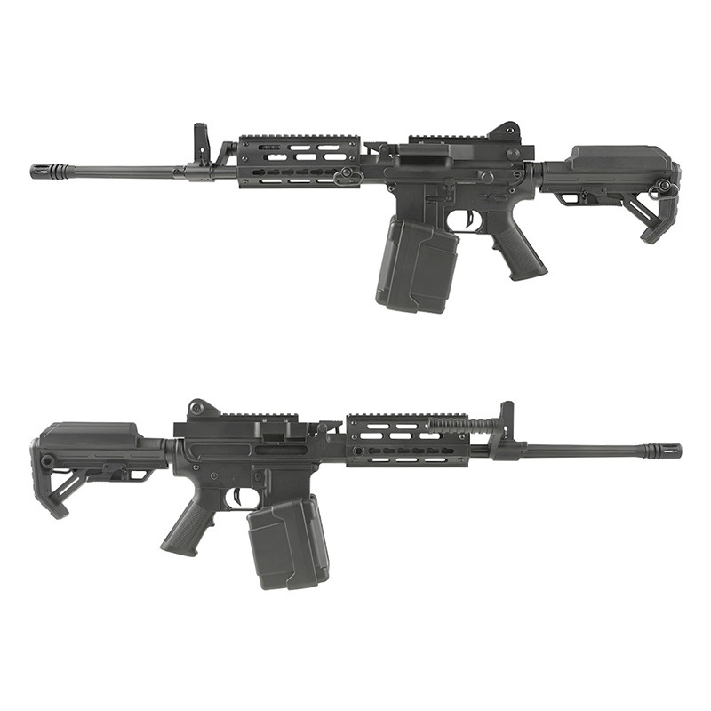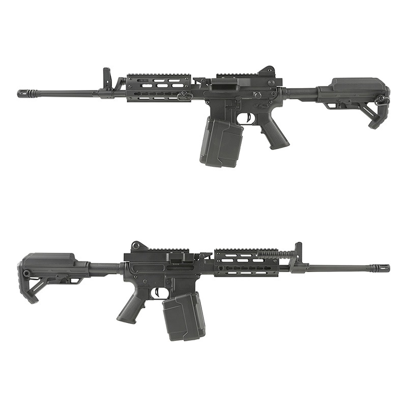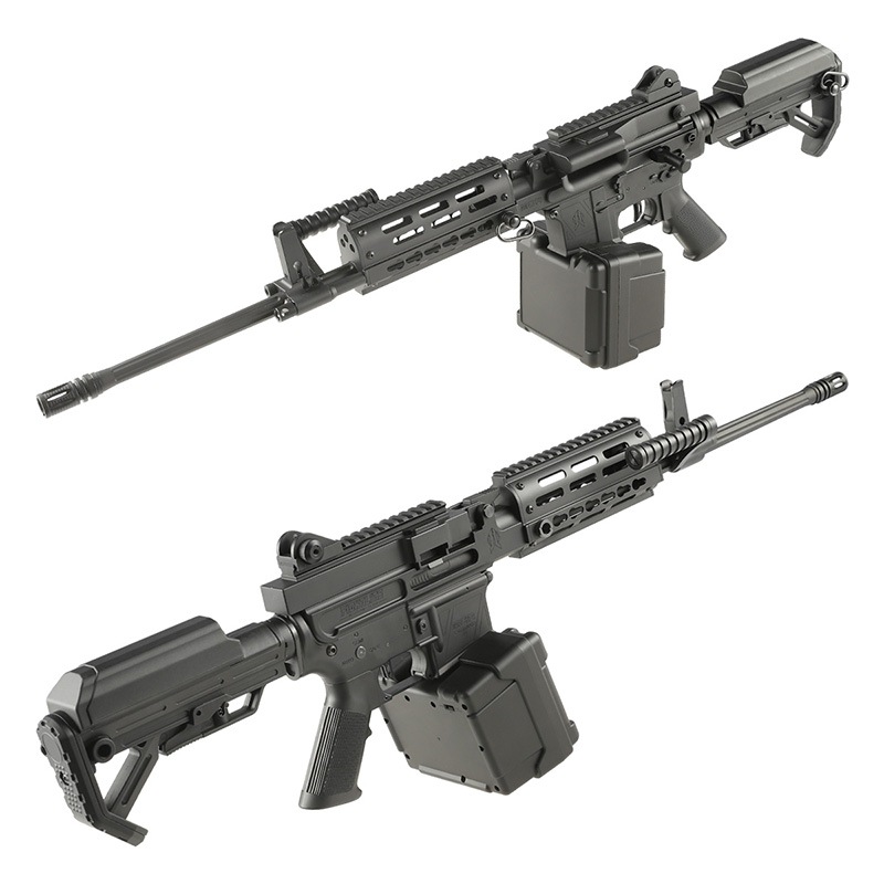 M4/AR-15のロアレシーバーをベースに、マガジン給弾、ベルト給弾式ボックスマガジンに対応させることが可能なアッパーキットが組み込まれたFightLite MCR(Mission Configurable Rifles)。 2種類のマガジンが使用可能なため、状況に応じた発射が可能となっており、機動力を重視する場合にはスタンダードマガジンを、 火力を発揮したい場合にはボックスマガジンの使用を選択することができます。