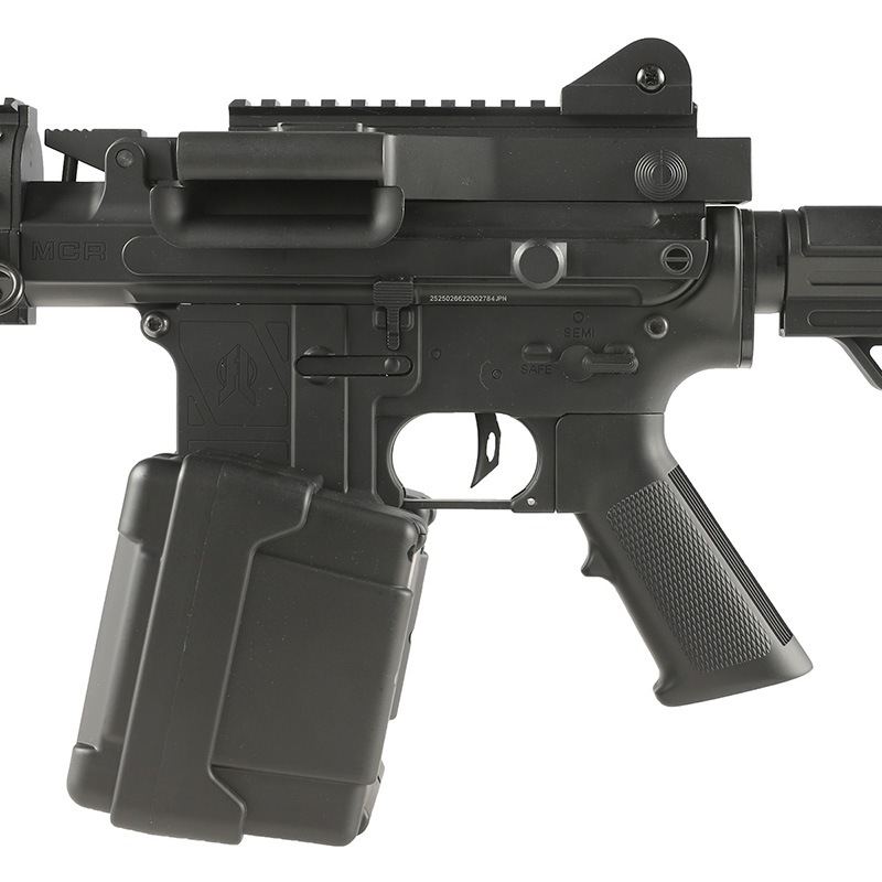 また、ボックスマガジンにはダミーカートが付属しリアルな外観。 単四電池×4本(別売)で稼働し、装弾はオート、音感センサーから選択可能。 装弾数は2000発と大容量となっており、LMGのような大火力を発揮することができます。