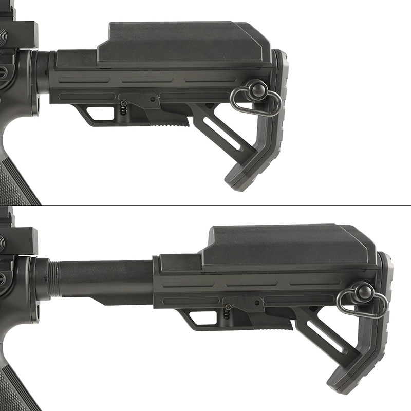 ストックはSI Viperタイプストックを搭載。 6ポジションで伸縮可能で、チークピースにバッテリーを収納することが可能となっています。