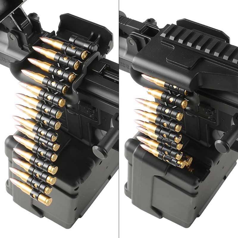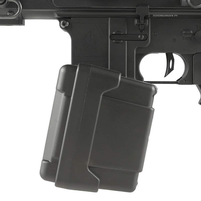 また、ボックスマガジンにはダミーカートが付属しリアルな外観。 単四電池×4本(別売)で稼働し、装弾はオート、音感センサーから選択可能。 装弾数は2000発と大容量となっており、LMGのような大火力を発揮することができます。