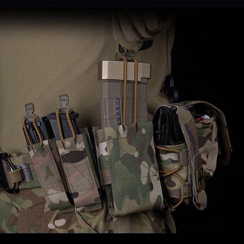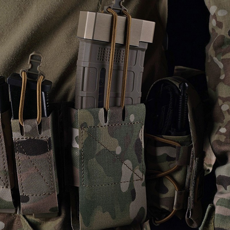 マガジンはショックコードと本体のエラスティックバンドにより固定され、長さを調整することで様々なマガジンに対応します。