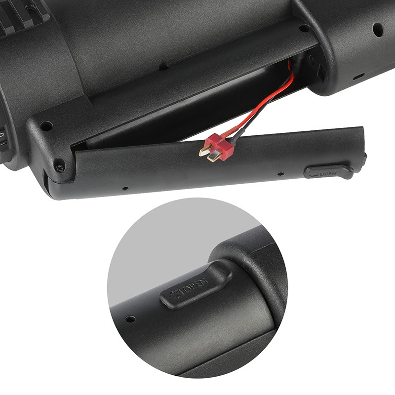 バッテリーは本体下部に収納され、幅約3.5cm × 奥行約14cm の広いスペースを確保しています。推奨バッテリーは 11.1V 3セル LiPo で、端子には通電効率に優れた T型コネクター を採用しています。