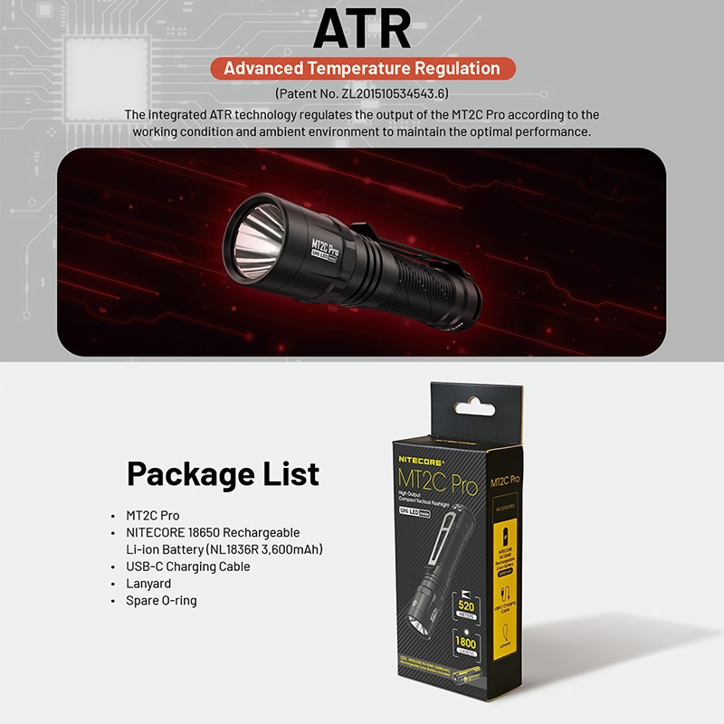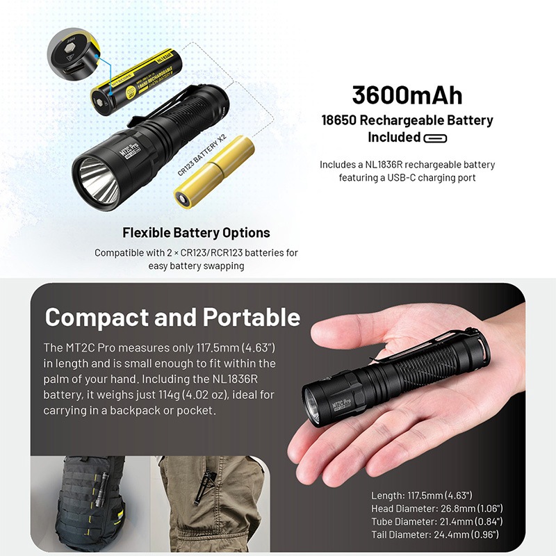 NITECORE(ナイトコア) MT2C Pro 高出力コンパクト タクティカル フラッシュライト 最大1800ルーメン/520m照射 Type-C 充電バッテリー内蔵