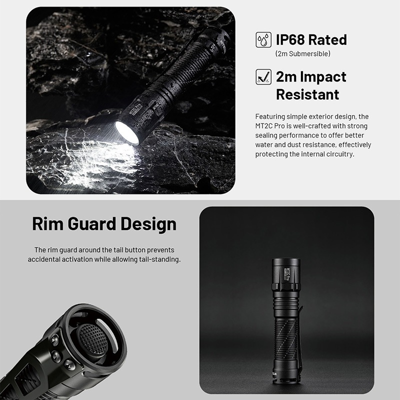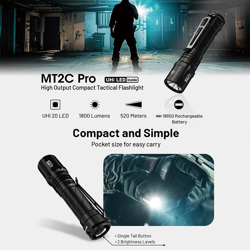 NITECORE製MT2C Proは、UHi 20 LEDを搭載した高出力・長距離照射対応のコンパクトタクティカルフラッシュライトです。最大1800ルーメン、最長520mの照射距離を実現しながら、シンプルなテールスイッチ操作と堅牢設計により、EDCから法執行・警備・アウトドア用途まで幅広く対応。USB-C充電対応18650バッテリーを標準付属し、安定出力を維持するNon-PWM定電流回路とATR温度制御により、過酷な環境下でも信頼できるパフォーマンスを発揮します。