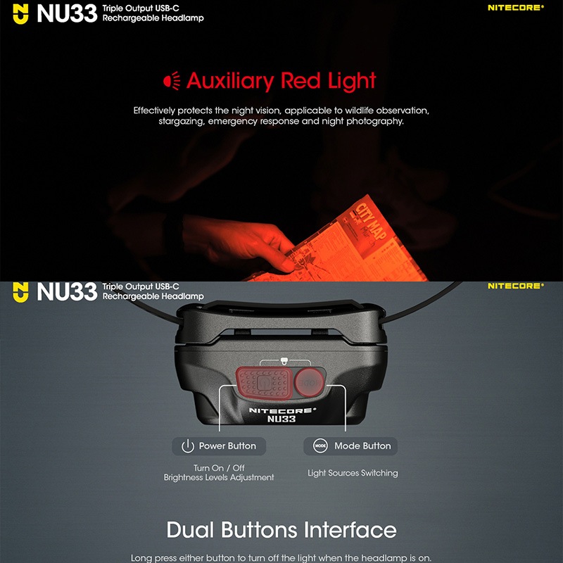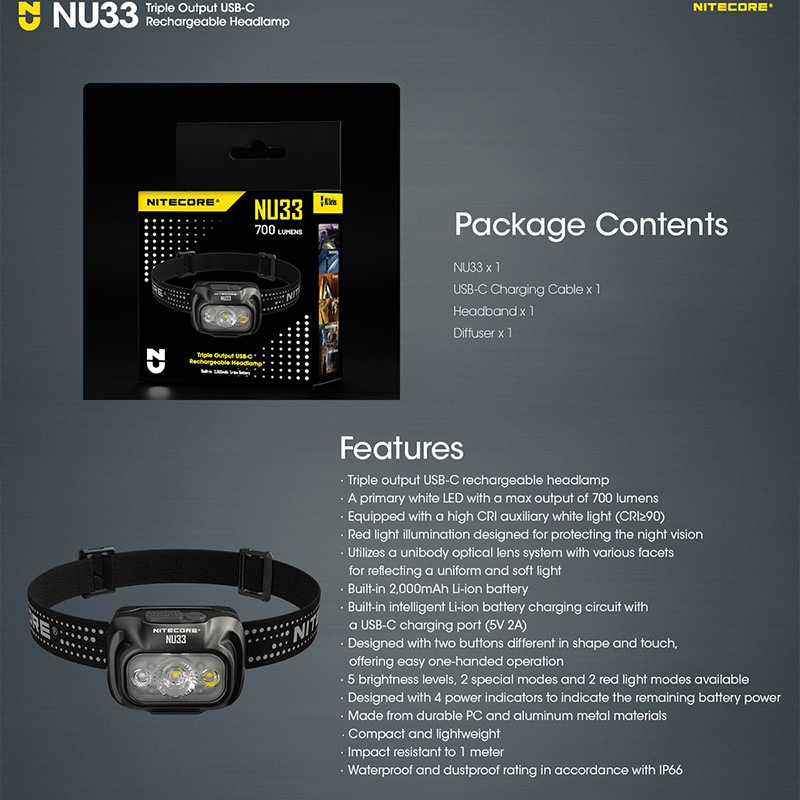 NITECORE製NU33は、最大700ルーメンの白色メインライトに加え、CRI90以上の高演色補助白色ライト、夜間視認性を保護する赤色ライトを備えたトリプル出力ヘッドランプです。USB-C充電対応の内蔵2000mAhリチウムイオンバッテリー、直感的なデュアルボタン操作、ロックアウト機能を搭載し、ナイトラン、キャンプ、登山、作業用途まで幅広く対応します。